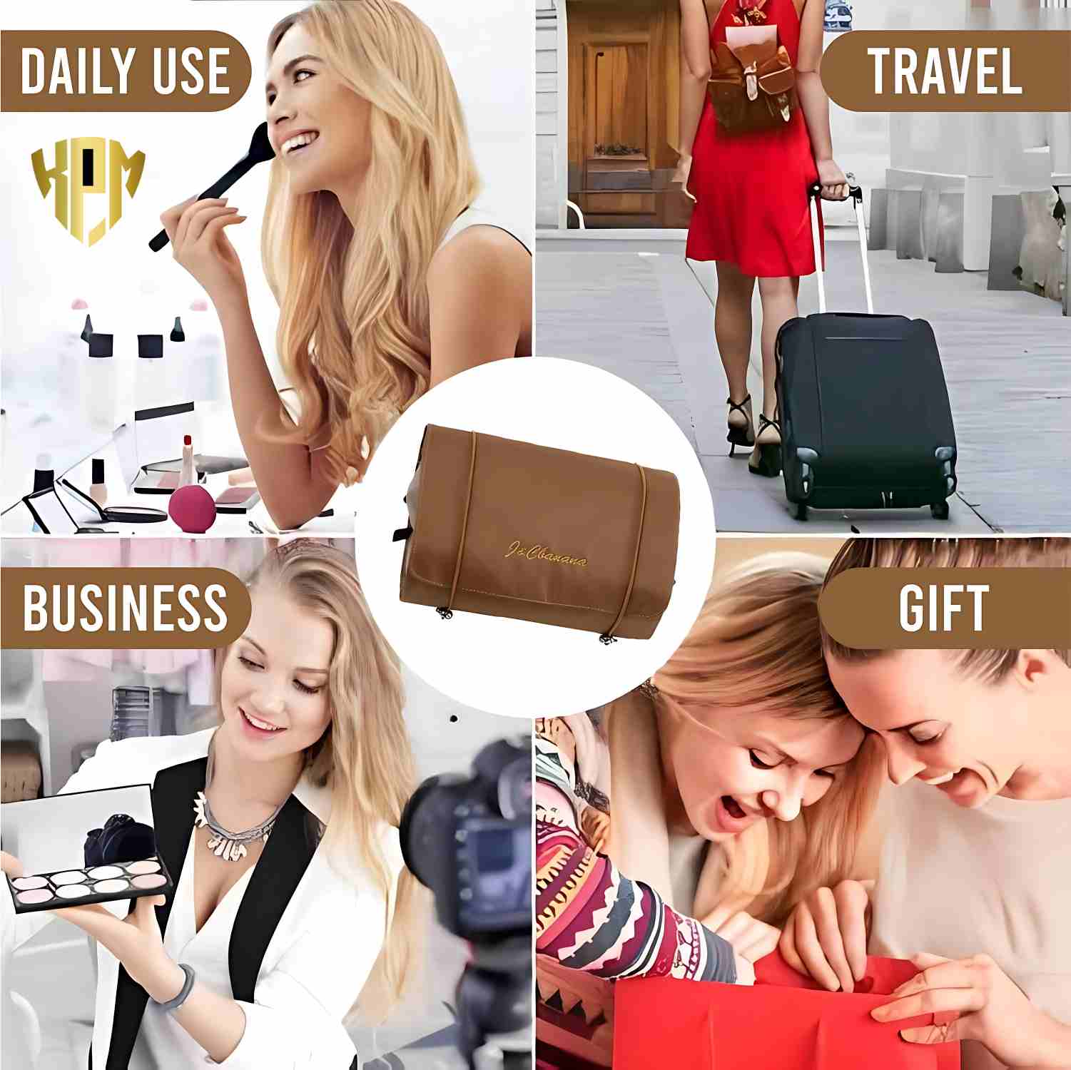KPM WORLD ™ Women’s Large Capacity Cosmetic Travel Bag – Waterproof Leather Makeup Organizer with Wide Opening, Dividers with Handle (Cross Open, Brown)