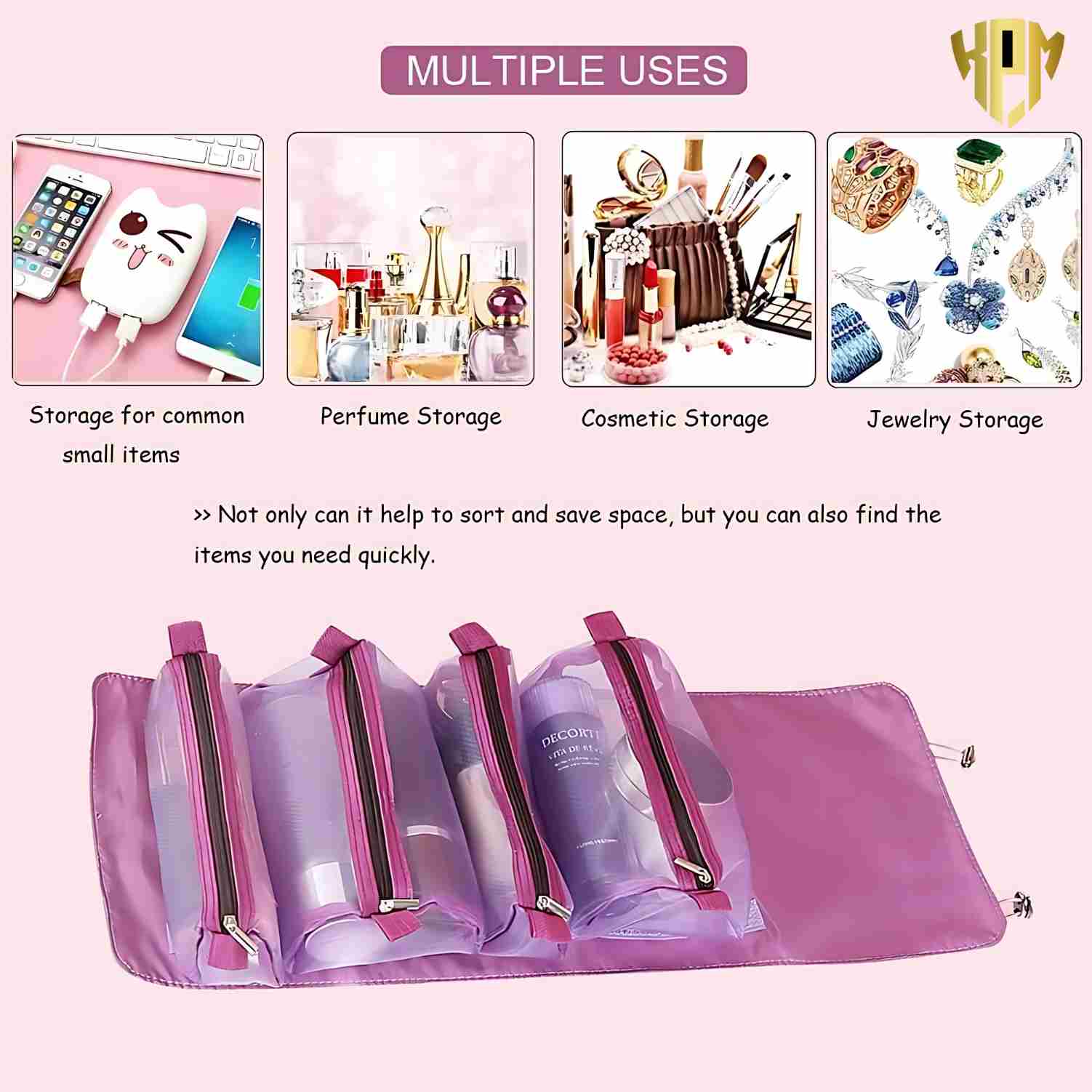 4-in-1 DETACHABLE BAG : Built-in 4 storage net bag(2 large and 2 small bags),waterproof and dirt-proof. Cosmetics can be sorted according to the category and your habits, and do not interfere with each other, which is easy and comfortable to find what you need.The set can also be hung, making full use of vertical space.