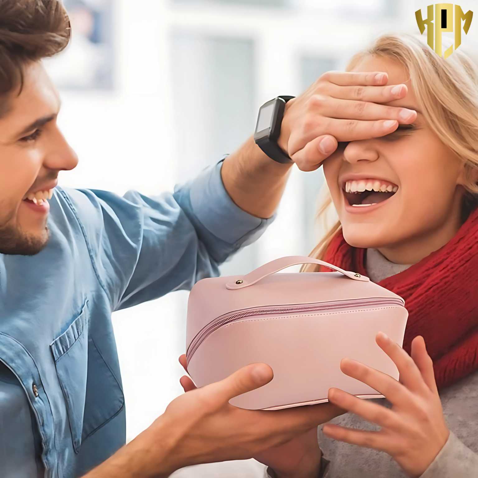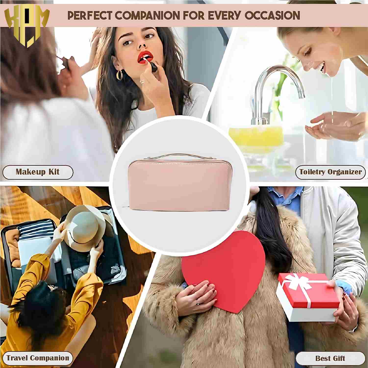 KPM WORLD ™ Women’s Large Capacity Cosmetic Travel Bag – Waterproof Leather Makeup Organizer with Wide Opening, Dividers with Handle (Cross Open, Pink)